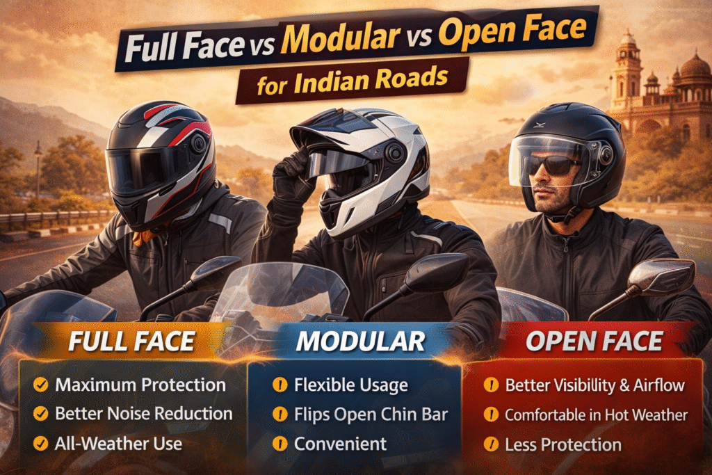 Full face helmets are the safest choice for Indian roads – maximum protection from dust, pollution, debris, and impacts in